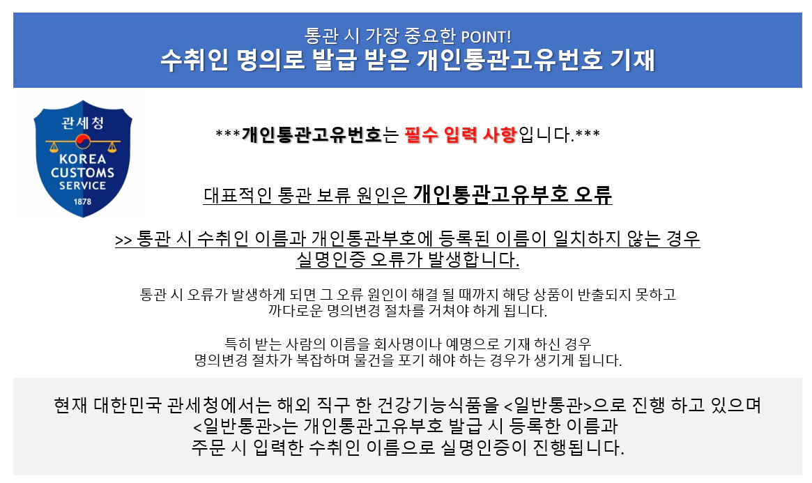 관세청 정보가 정확해도 쇼핑몰이나 배송대행지에 입력한 정보가 다르면 통관 오류가 발생할 수 있습니다.